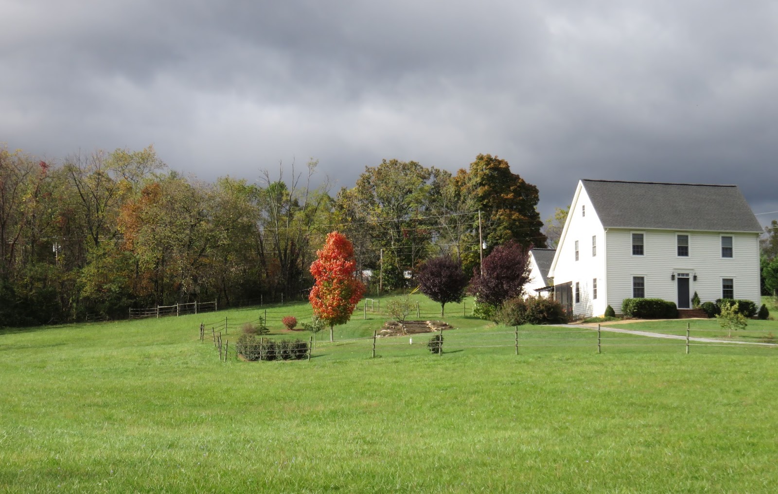 With respect to our Virginia, she has given us some very pretty autumns. She grows a different variety of trees than New England and I cant fault her for that. Her beautiful oaks turn brown, and the black walnut and hickories turn yellow. The eastern white pine and cedar will remain green and the hornbeam and chestnuts also remain rather dull, I think. There are many varieties I am not familiar with, but I do know the sugar maple and I think that is what is missing here for its brilliant colors of reds and oranges. What Fincastle will give us is the smell of fallen leaves on Halloween night, if we choose to walk around town that evening. The dogwoods are a beautiful, dark burgundy color and Ikenberrys smells wonderful with their bins of apples. But, my biggest joy each autumn comes from one of our four maple trees. No matter what type of autumn we have, bright or dull, this one little tree produces the most spectacular color for us. These photos were all taken today and show the countryside around our house. It's beautiful with or without colorful leaves, but as you can see, our maple tree stands out and reminds me, just a little bit, of what a New England autumn looks like.